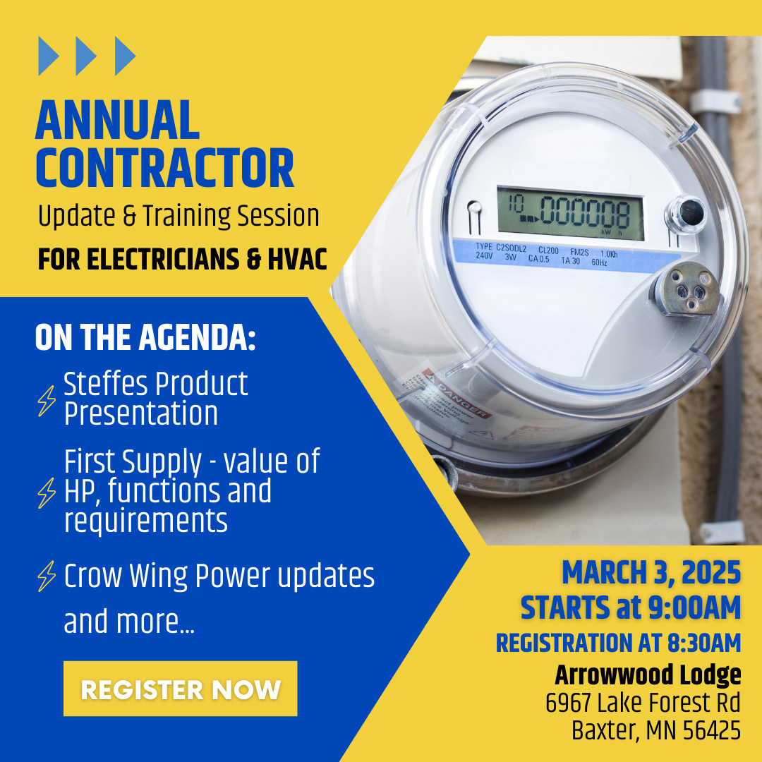 Crow Wing Power’s Annual Electrical and HVAC Contractors Meeting is Tuesday, March 3, 2026 at The Lodge in Baxter. The meeting starts at 9:00 AM, registration begins at 8:30 AM, and will cover Steffes Product Presentations, First Supply information including functions and requirements, and other Crow Wing Power and Electrical Cooperative changes and news. Please indicate if and how many people will be having lunch.